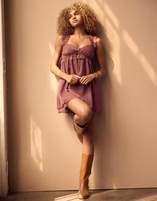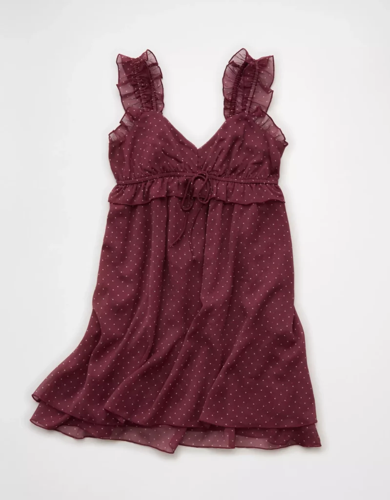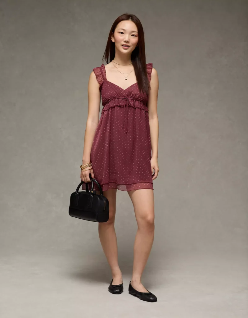 At first glance, the dress captures attention with its playful ruffles and flattering mini cutoff. The layered chiffon fabric adds airy movement, while the built-in slip ensures comfort and coverage. It’s a look that radiates fun without compromising on ease. American Eagle Outfitters
